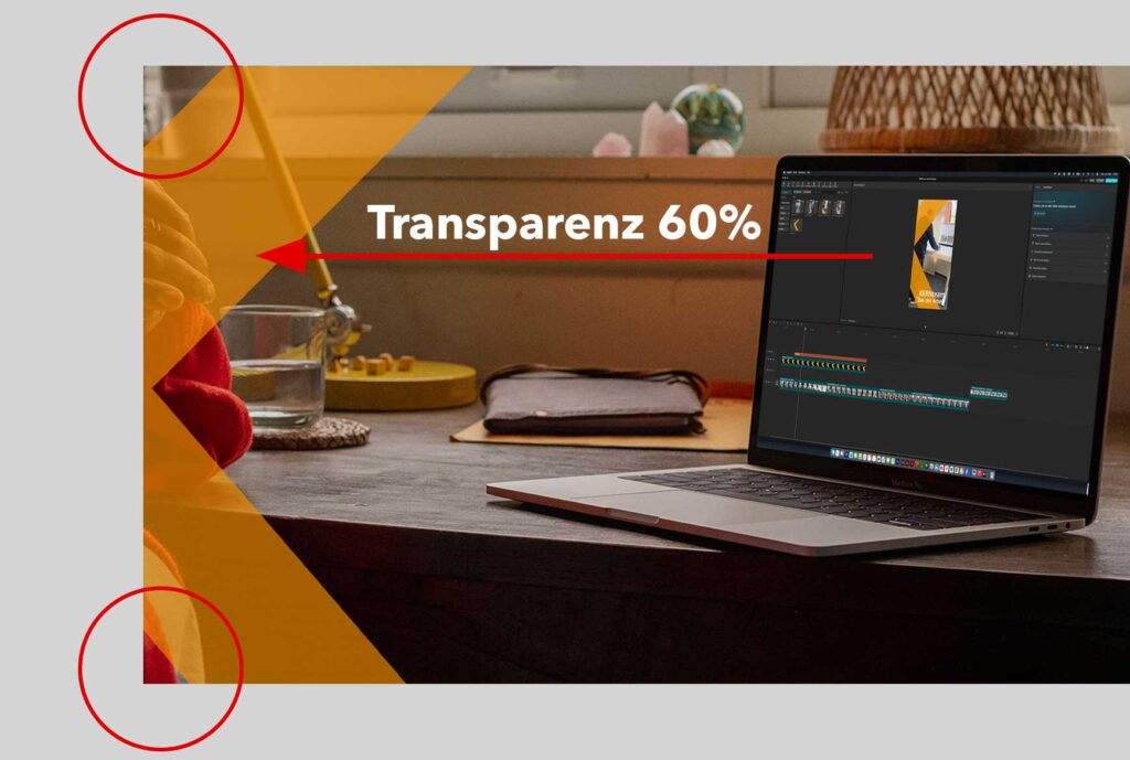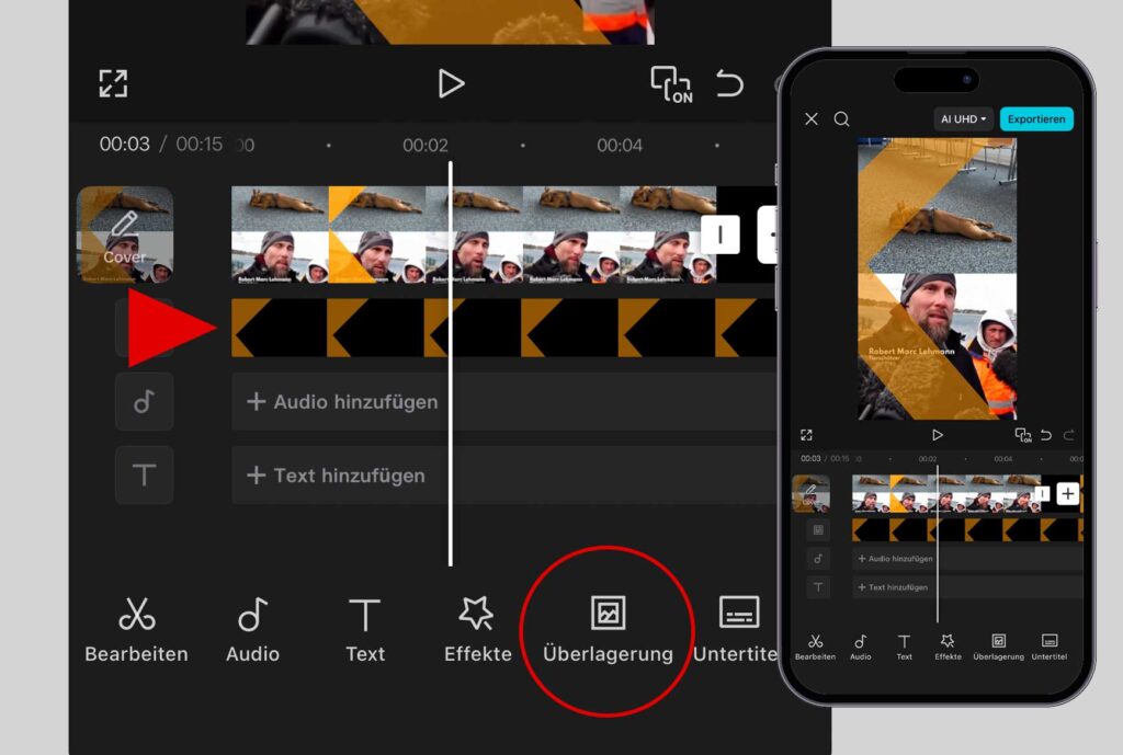 Video auswählen. Anschließend das Key-Visual „K“ hinzufügen. Dieses Element auf „Überlagerung“ stellen – fertig.